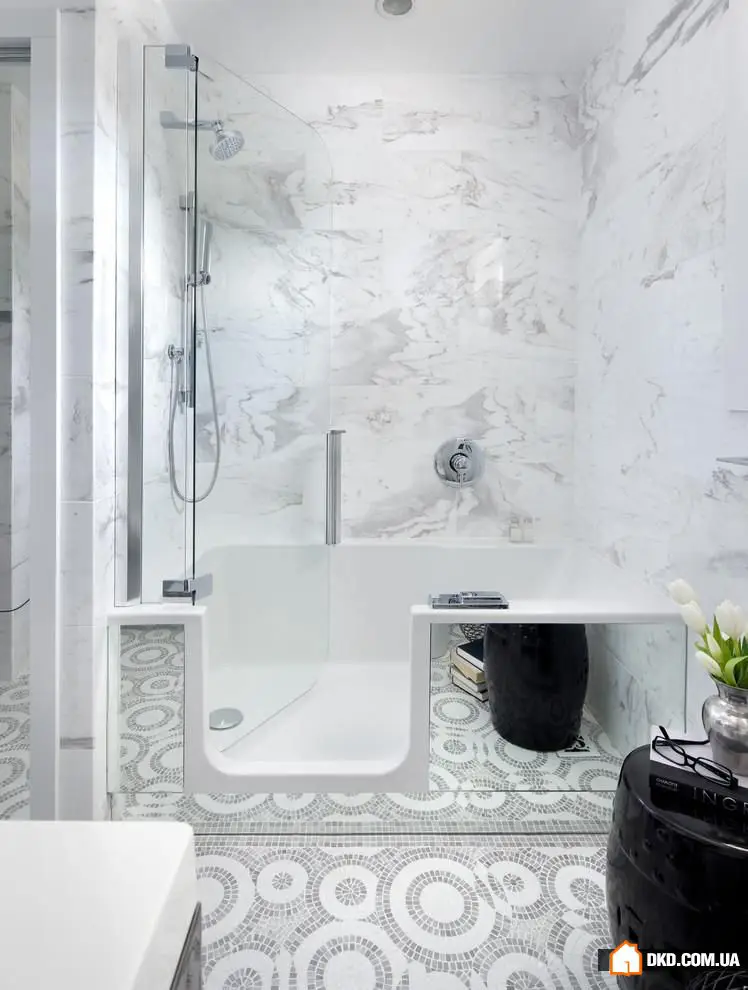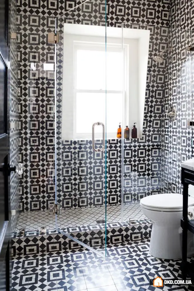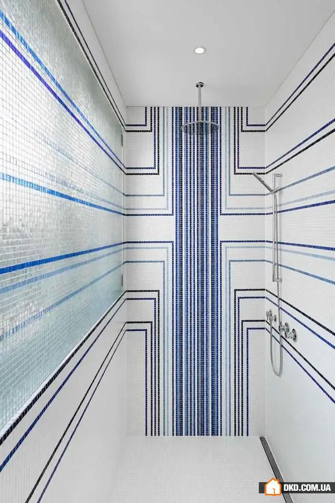 3. 几何图案。由小马赛克瓷砖制作的不寻常几何图案,将为您的每日浴室生活注入难以置信的能量。电脑可以帮助您创建合适的图案并正确选择瓷砖。