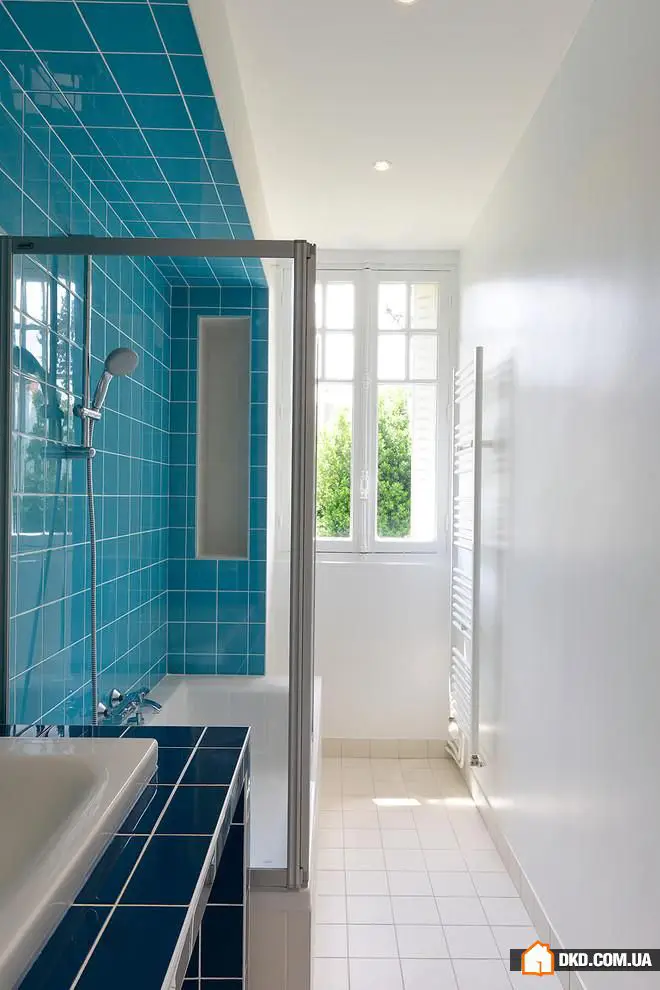 7. 不要害怕过度设计。在整个浴室使用鲜艳颜色的瓷砖,包括地板甚至天花板——这是一个很棒的想法!这种设计在欧洲越来越受欢迎,因为其新颖性和与传统单调浴室的对比。