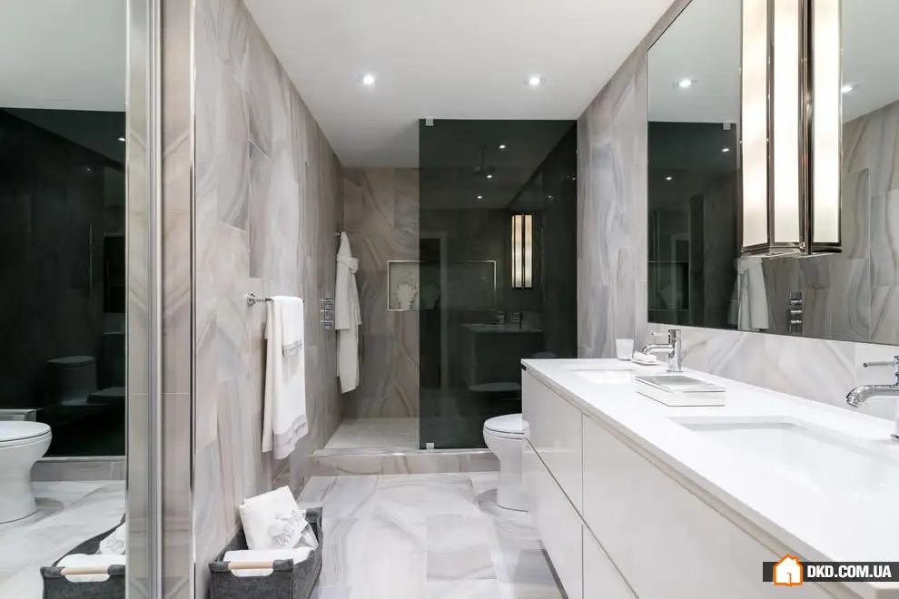 12. 灰色玻璃。瓷砖并不是为浴室增添一点戏剧性的唯一方式。淋浴间与浴室之间的固定隔断,用柔软灰色代替传统透明色看起来尤为出色。