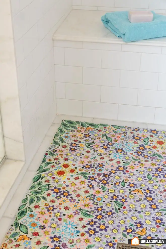 6. 地面焦点。如果您想用鲜艳多彩的图案装饰浴室,但不确定在大面积开放墙面看起来如何,可以在地面自由表达。这将是一个真正独特且充满活力的浴室。