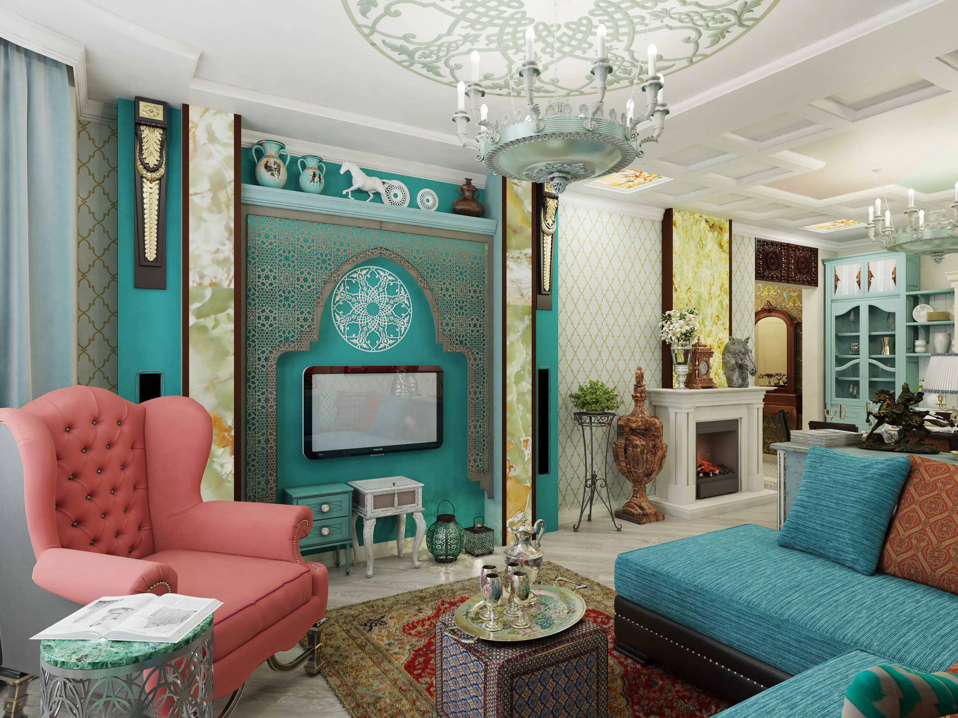 2. 你是否认出了这个餐厅中充满异域风情的室内设计?它的每个细节都散发着这种风格的魅力。通过明亮绿色与柔和白色色彩的和谐搭配,房间变得非常明亮而通风。