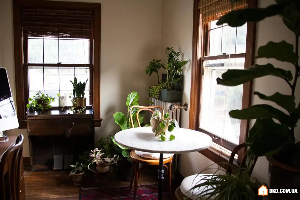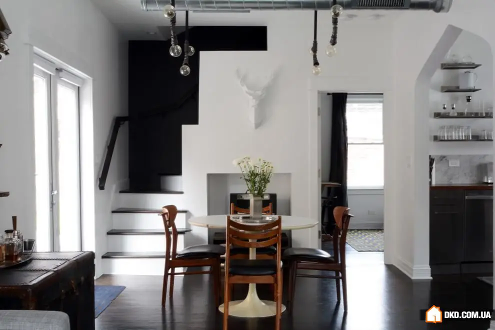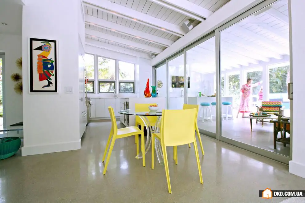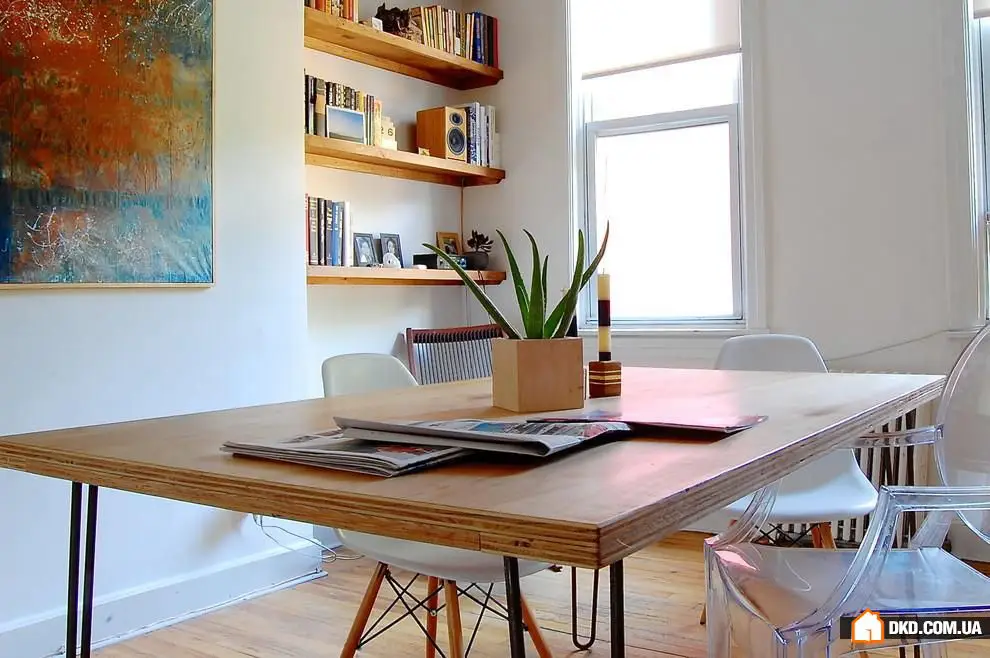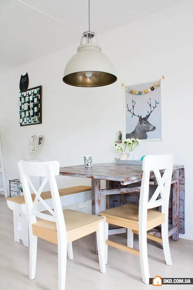 6. 这所房子中的折叠式餐厅是由主人亲手制作的。它与白色墙壁协调良好,在需要时可以折叠起来,为其他家庭活动腾出空间。