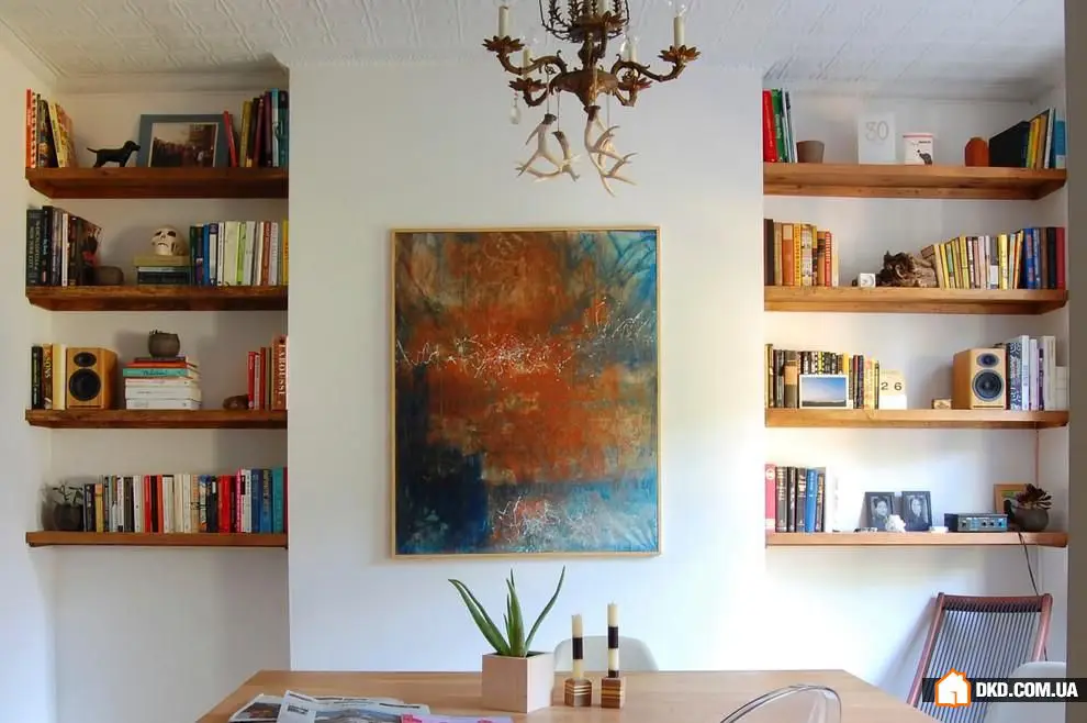 4. 布鲁克林这个闪闪发光的餐厅简洁干净,是经过深思熟虑的颜色搭配的结果,同时也因为一幅大型艺术画作打破了室内单调感。开放式的书架邀请客人放松,也展现了主人开放和积极的心态。