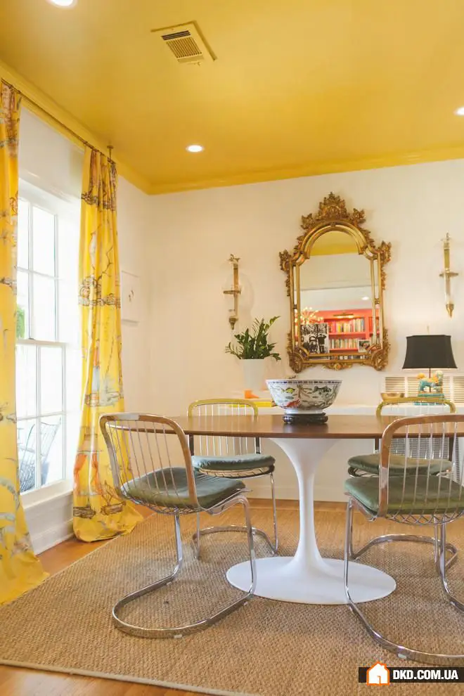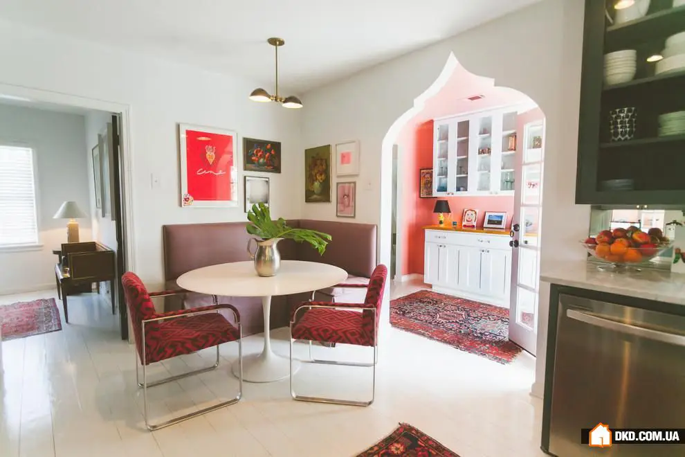 5. 色彩与生活——这是德克萨斯州这座平房的室内设计格言。厨房包括一个舒适的早餐角落,配有纺织面料覆盖的扶手椅、画廊墙和浪漫的黄色窗帘。