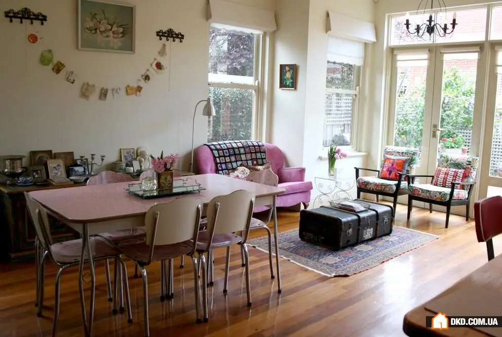 在狭长的空间中,家具不仅应沿墙摆放,也应横跨空间布置,以避免让房间看起来更长。透明桌子和薄木头椅子在这种环境下看起来很棒。