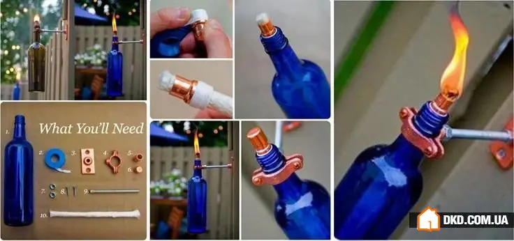 13. 使用装满油的瓶子制作户外油灯。