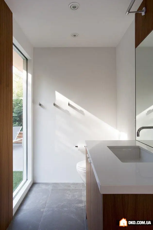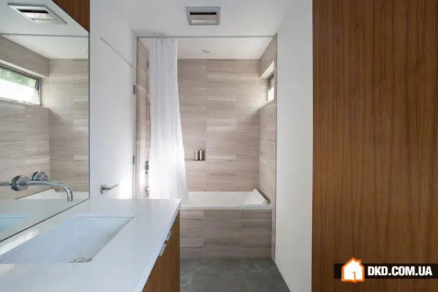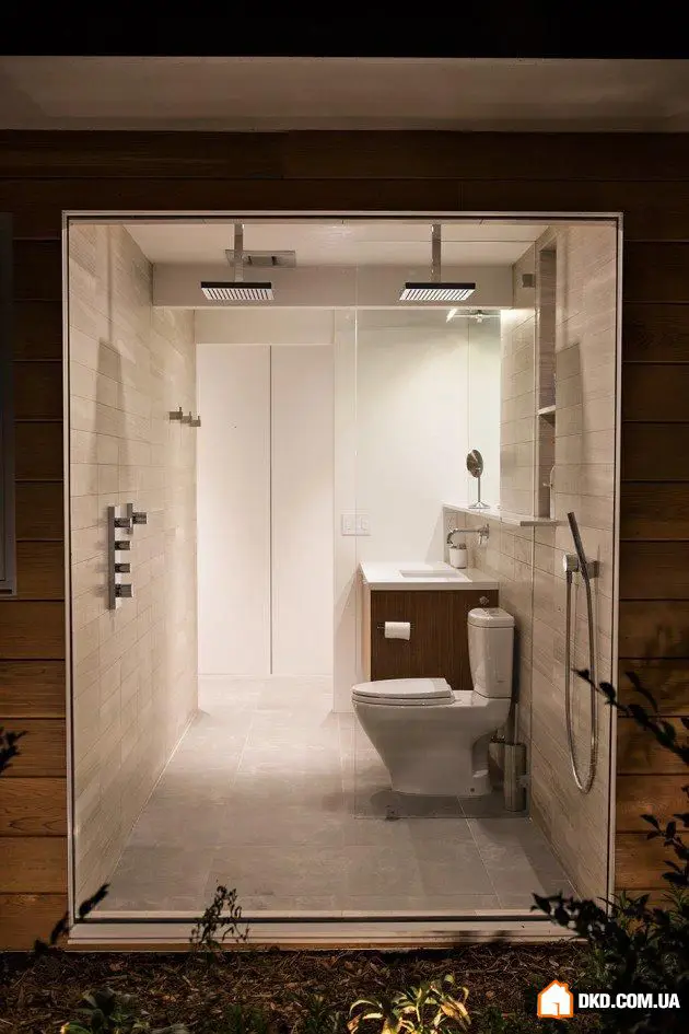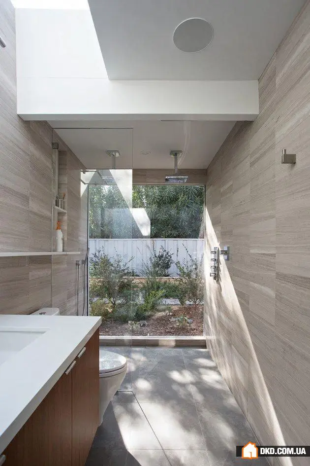 自然材料如玻璃、木材和石头也广泛应用于室内装修,进一步增强了房屋内外和谐的自然氛围。在这种背景下,宽敞的浴室甚至配备了一面全高的玻璃墙。由于这一设计选择,人们可以轻松感受到仿佛在清晨绿柳树荫下沐浴的舒适感。