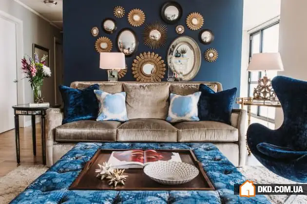 颜色选择对Oliver来说是一项非常重要的任务:他将深蓝色和灰色调与Benjamin Moore油漆及闪亮的珍珠色泽混合。这种配色在视觉上拉伸了天花板。变幻的颜色不仅反射窗户的自然光,还突出了室内金属装饰元素。这样的天花板在视觉上扩展了客厅空间:视线不会停留在天花板的装饰线上,而是让房间感觉无限延伸。