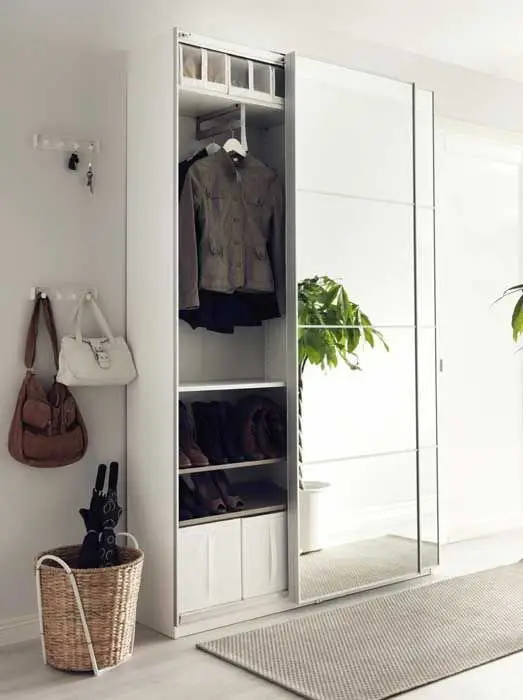 解决方案:将物品放入衣柜——这是解决问题的最佳方法。容量和深度取决于走廊的大小,在狭窄的过道中,您应该放弃复杂的存储系统。您可以选择立式或嵌入式衣柜。如果您有一个大家庭,避免使用开放式挂衣架——它们会造成拥挤和混乱的不愉快效果。