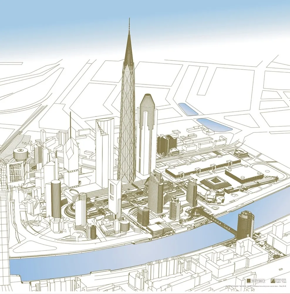 鲍里斯·托尔的莫斯科城市早期规划图但随着新时代、民主俄罗斯的开始,当局再次需要通过前所未有的建筑来确立自己的地位。对莫斯科而言,这样的建筑是莫斯科城市商务中心。据传,这个城市的概念是由建筑师鲍里斯·托尔向卢基扬诺夫提出的,他是奥运体育综合体和新阿巴特大道的共同作者。根据托尔的规划,摩天大楼围绕着一个U形公园,逐渐从巴格拉季昂大桥向东北角的俄罗斯塔方向增长。因此,城市南部低层建筑不会阻挡北部对城市和河流的视线。