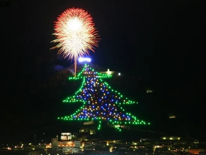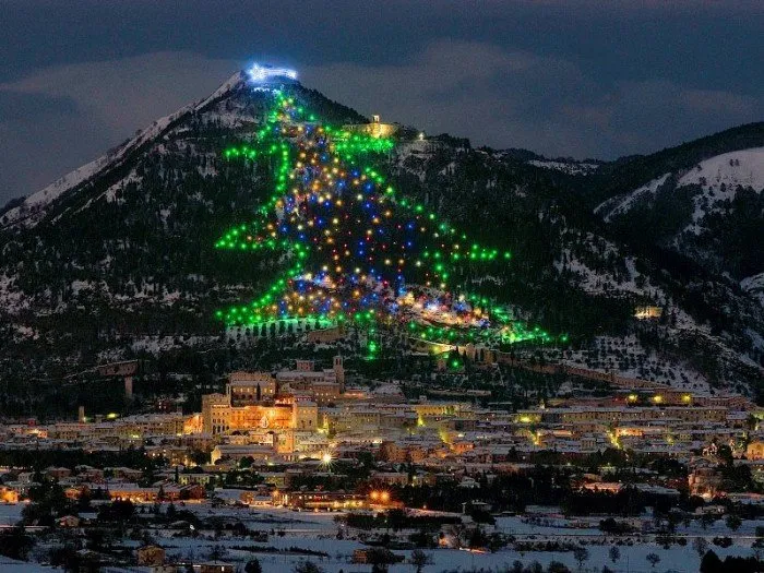 在意大利的因迪诺山坡上,位于古比奥市的地方,有一座巨大的节日树装置闪闪发光。这座树每年圣诞节都会组装起来,已有几十年历史。它的高度超过650米。仅顶部由200个灯泡组成的星星就覆盖了1000平方米的面积。1991年,古比奥的圣诞树被载入吉尼斯世界纪录。