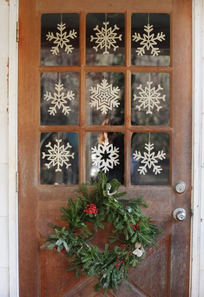 为节日定下基调,装饰你的前门和窗户。你可以按照欧洲传统在门上挂一个松树花环,而在窗户上贴用纸巾或铝箔剪出的雪花。