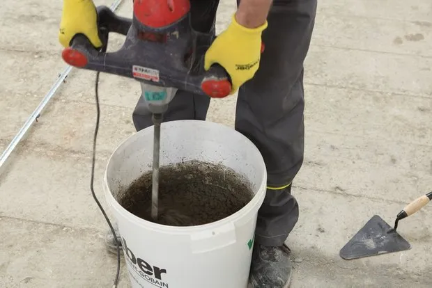 将精确测量的水倒入桶中,加入一袋干混料,使用功率为400-600转/分钟的强力搅拌机充分搅拌至均匀一致。混合物应在加水后30分钟内使用。