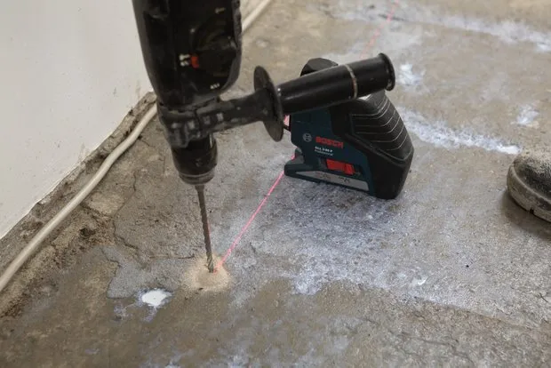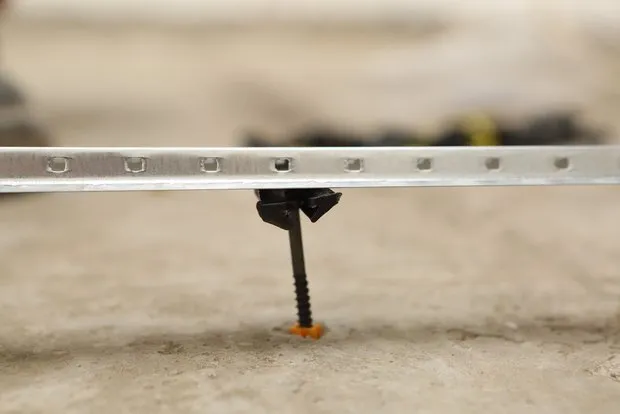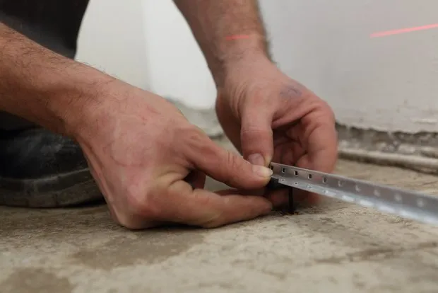 必须使用特殊的找平块来控制地面找平过程。底漆干燥后(2-4小时)使用激光水平仪和水平尺测量基础不平整度。在基础表面以1-1.3米的间距安装坚固的金属“块”,使用weber.vetonit 5000找平砂浆溶液将块固定在基础上。