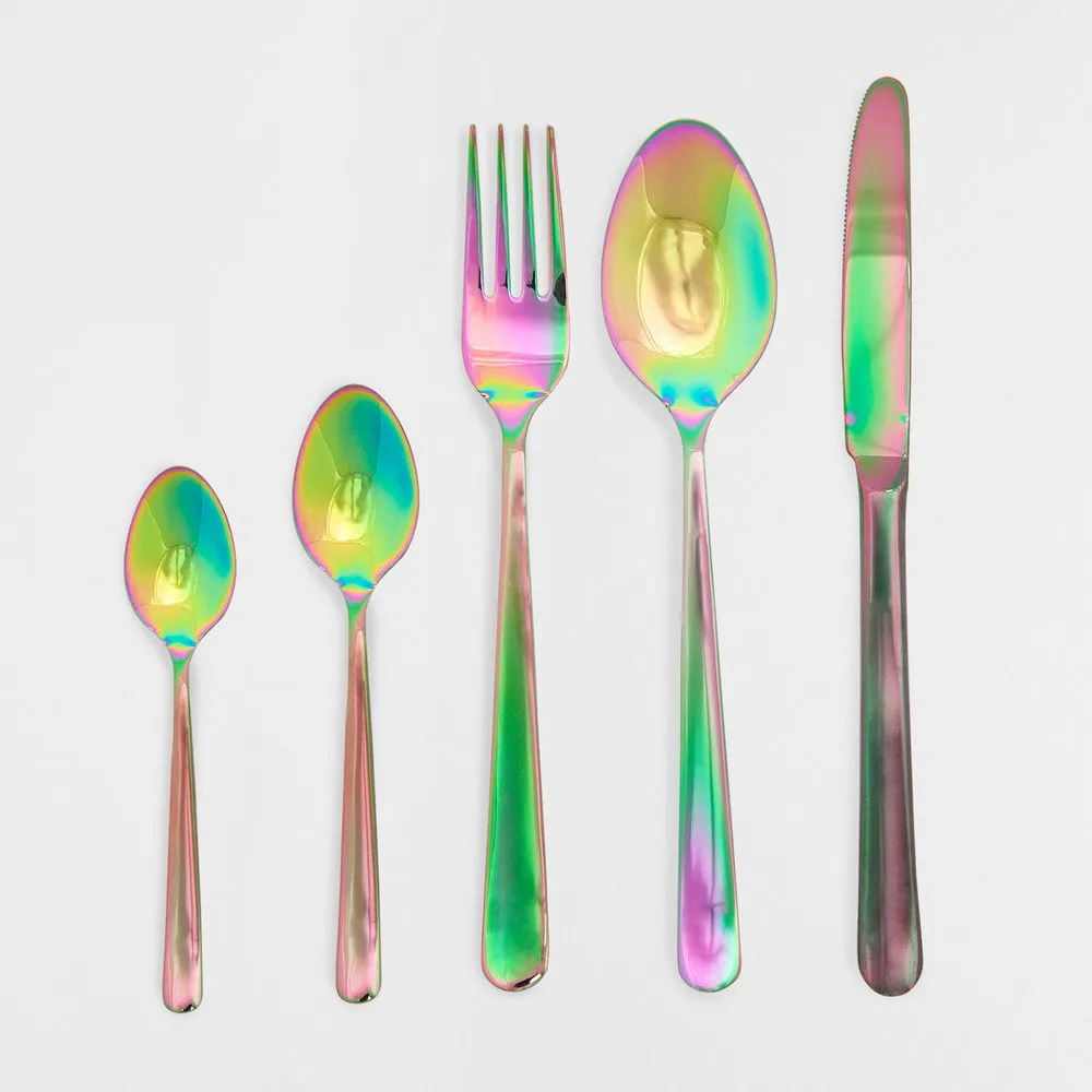设计新的餐具并不容易,但创造这些带有彩虹般色彩效果的叉子、勺子和刀具的设计者们做到了。完美的背景是未漂白色调的亚麻桌布。