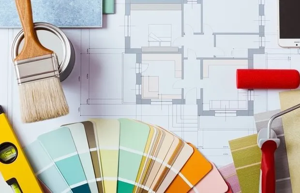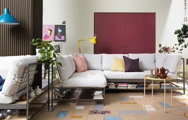 另一种让室内看起来更为宽敞的视觉技巧是抬高的天花板。墙面只涂成灰色到一定高度:用天花板颜色涂宽条带,使墙面看起来更高,房间本身也显得略微更大。