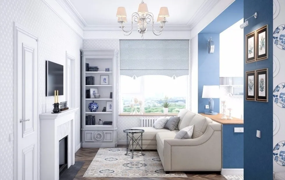 特别值得关注的是卧室与厨房区域之间的玻璃窗。实际上,它起着一种半隔断的作用,具备多种功能。首先,它在视觉上使公寓的主要部分看起来更加宽敞;其次,它为烹饪区域提供充足的自然光线;第三,它有助于避免在小卧室中产生过于封闭和局促的感觉。