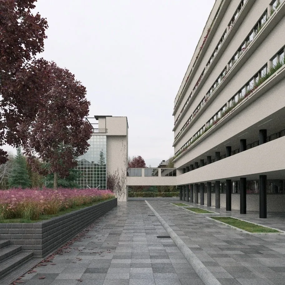 长达六层的住宅楼平行于诺金斯基大道而建。公社建筑则建在附近:它应容纳厨房、餐厅、图书馆、体育馆和俱乐部区域。居住区通过一个玻璃走廊与之相连——恶劣天气无法阻碍居民的休闲活动。第三栋建筑只有两层:这里是车库和机械洗衣房。