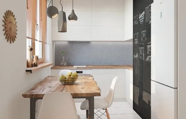 这里没有特殊要求:唯一需要注意的是悬挂灯具或吊灯的颜色。它可以是黑色以与明亮的天花板形成对比,或者有第三种颜色以完全对应其他设计元素:台面、柜门、椅子、软质家具面料等。