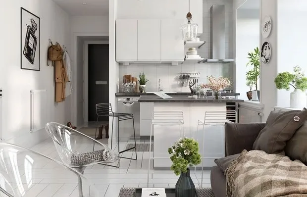 选择具有光泽门板(镜子或玻璃可用在此处)和铬把手的橱柜。最好购买座椅角度非常光滑的椅子。桌子可以是圆形并配有玻璃台面。即使在空间充足的房间中,也不建议过多家具和设备杂乱摆放——这种风格强调空间自由移动。