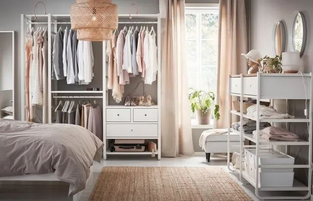 秘诀在于选择紧凑型家具。顺便说一下,请注意:储物系统巧妙地结合了不同深度的架子,以及开放式和封闭式架子。同时,房间中的墙面装饰几乎为零,以避免视觉上使本就有限的空间显得拥挤。