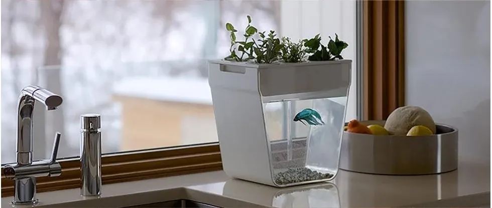 工作原理:套装包括一个小鱼缸、一个植物容器和罗勒、生菜或小麦的种子。植物放在鱼缸上方的盒子中——它们利用鱼缸中的水生长,同时净化水质。