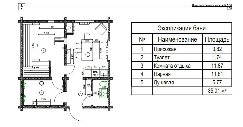 我们建造了一个35平方米的浴室,带一个小露台。浴室包括蒸汽室、淋浴间、带有厨房的休息室和卫生间。该项目实施耗时6个月。