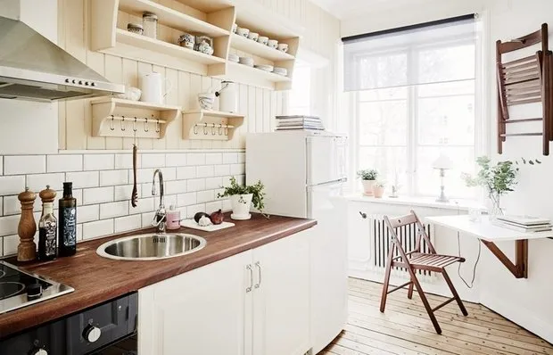 注意滑轨——长杆和挂架,您可以挂在上面厨房用具,从而无需许多笨重的橱柜。后者可以部分被壁架替代。如果购买的橱柜套装有向上打开的门而不是滑动门,这会妨碍通行,那也很好。另一种选择是百叶窗门。