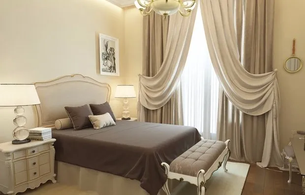 对于卧室内部设计,建议使用中性、温暖和柔和的色调,如粉色或桃色。示例照片显示了这一点。蓝色或紫罗兰色调——冷色调也适合。最好用小窗帘、薄纱或罗马帘装饰窗户。
