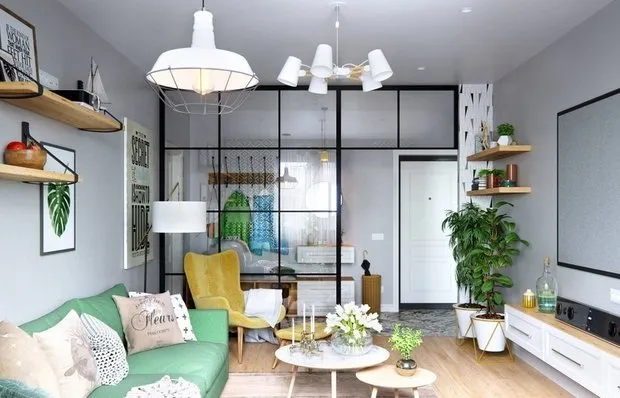 - 完美的解决方案是使用色彩调色板划分区域。例如,卧室区域用淡色调,而客厅则使用鲜艳饱和颜色的软体家具。