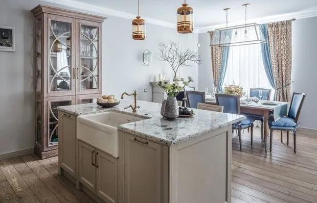 另一种视觉统一厨房与客厅的方法是使用相同的地面覆盖材料。但应该选择哪种类型呢?木地板在厨房中并不总是实用,而陶瓷砖和石材又太冷。因此建筑师阿莲塔·布图索娃和叶丽萨维塔·克列布尼科娃选择大理石底材,但在客厅中铺设了由木地板板制成的“地毯”。