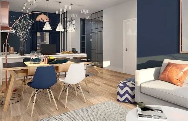 - 通过家具。最受欢迎的选项。客厅可以同时有多个区域。沙发可以作为白天坐卧的地方,也可以作为睡觉的地方。此外,沙发还可以将用餐区与厨房和客厅分开。家庭成员和客人可以在一个空间内活动而不互相打扰;