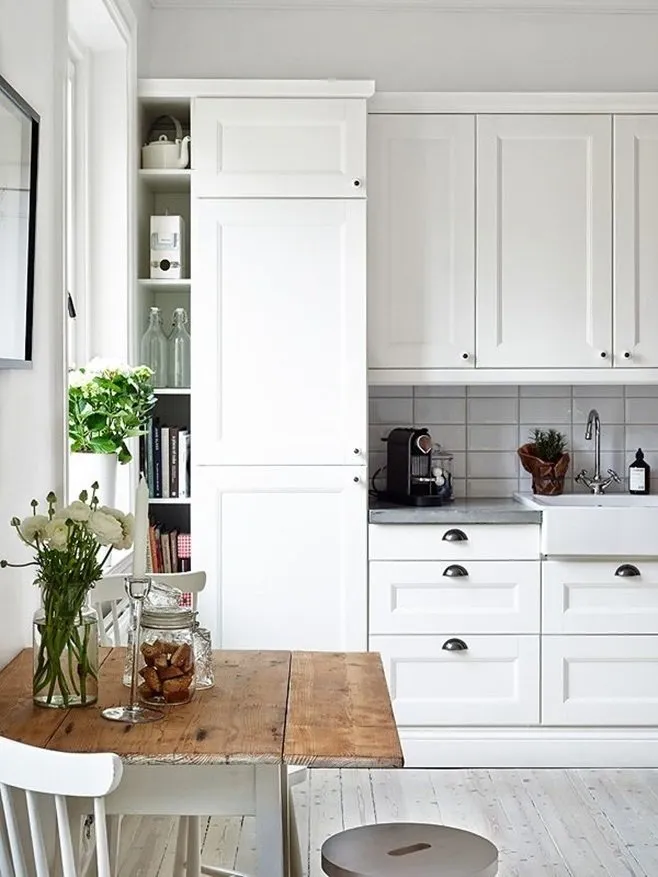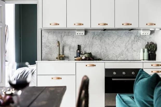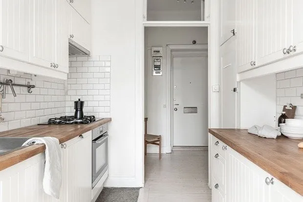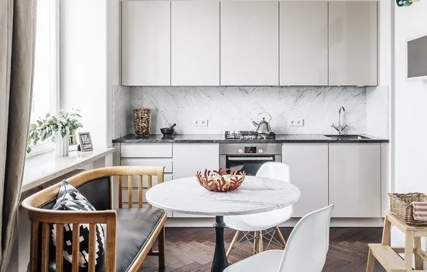 为了让厨房的橱柜在小空间中不显得杂乱,建议选择与墙面相同颜色。这个简单的小技巧能将体积较大的家具在视觉上融入空间。