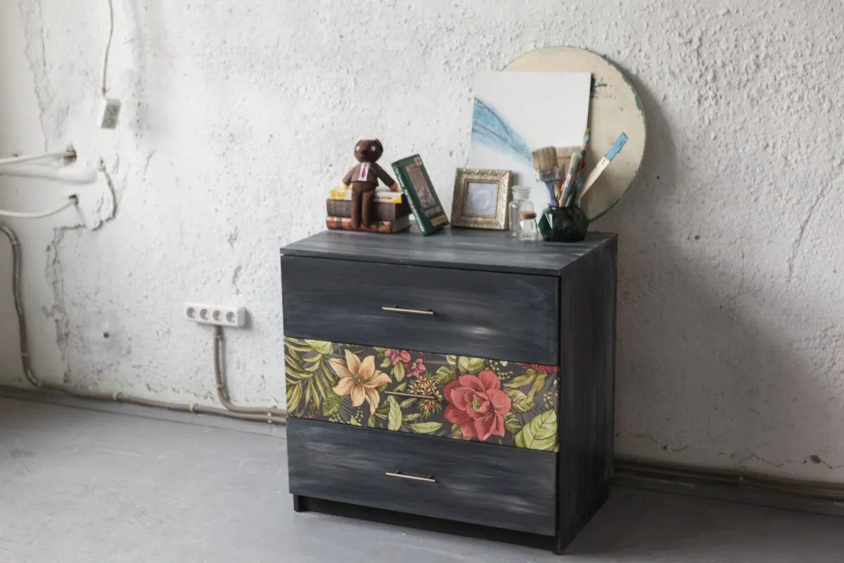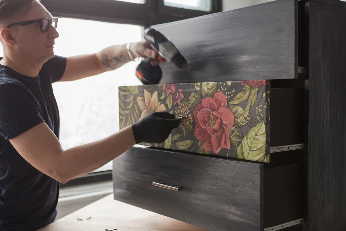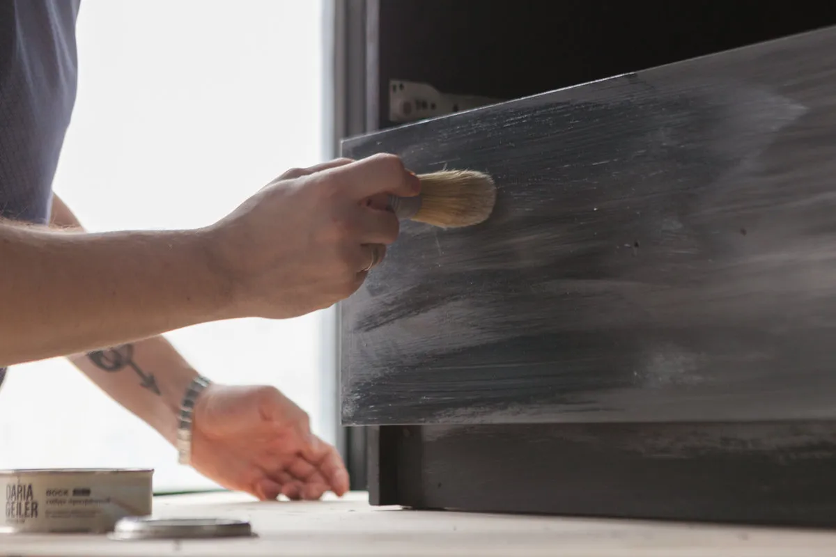 继续装饰其余面板和柜体。我们的墙纸背景为黑灰色——油漆我们选择了同样的色调。首先涂两层黑色油漆,每层都需晾干。