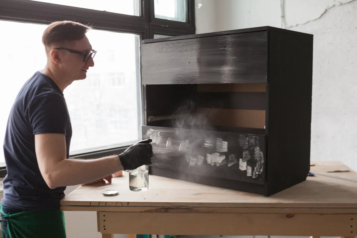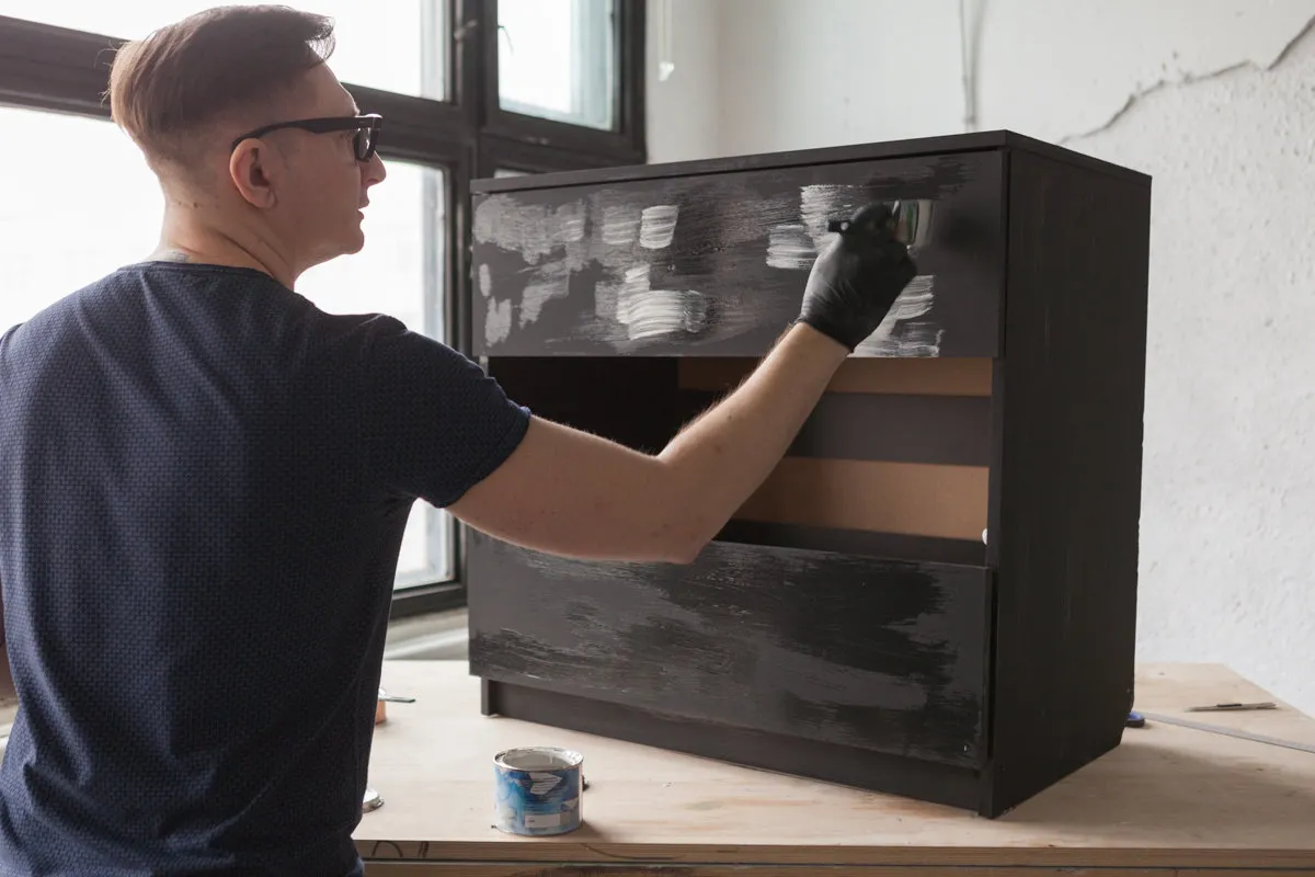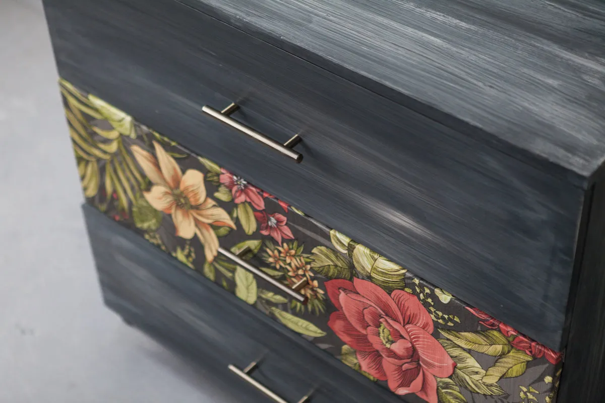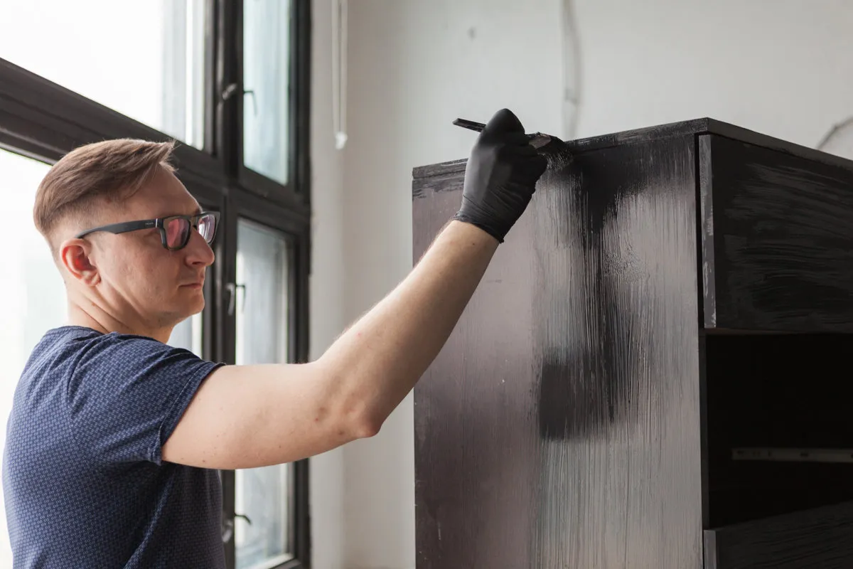 继续装饰其余面板和柜体。我们的墙纸背景为黑灰色——油漆我们选择了同样的色调。首先涂两层黑色油漆,每层都需晾干。