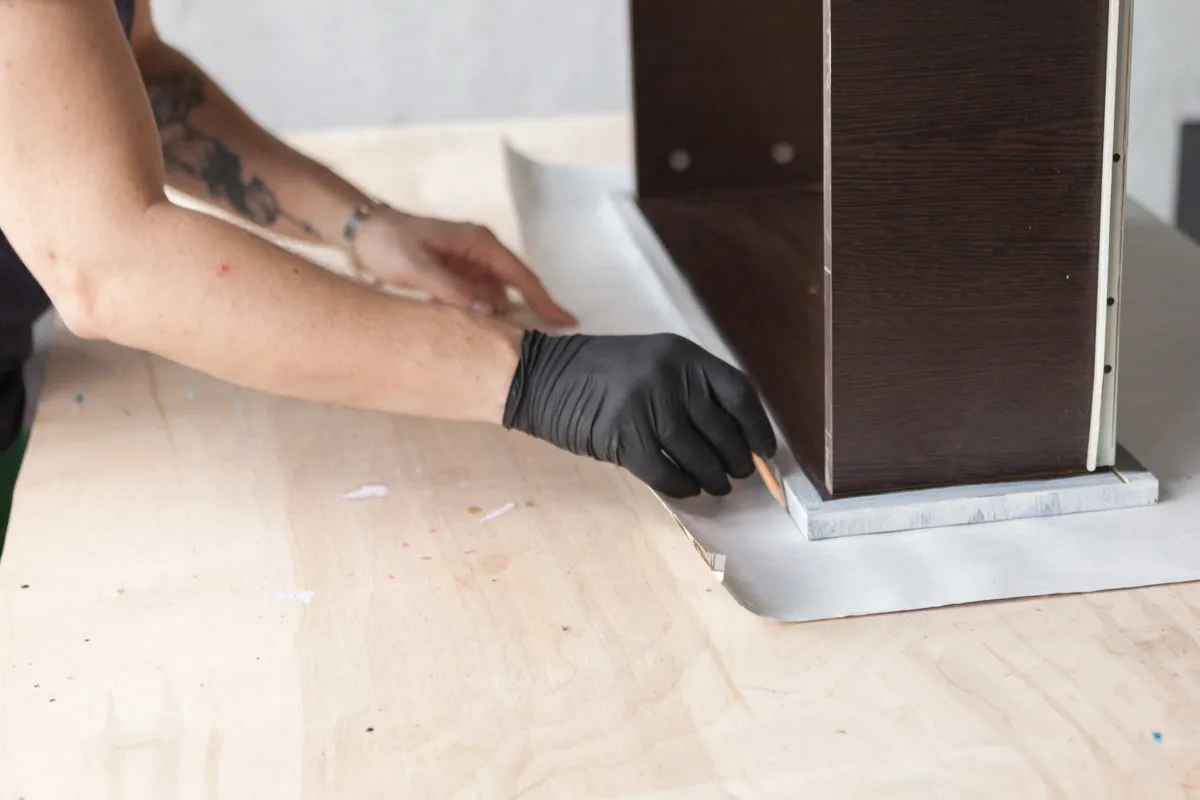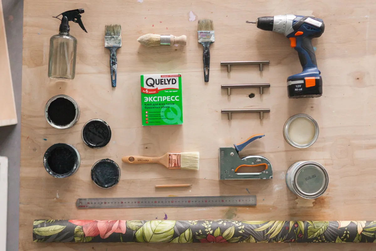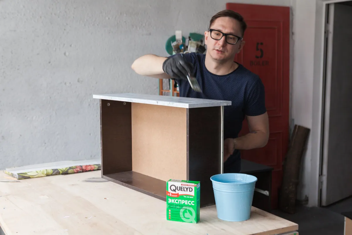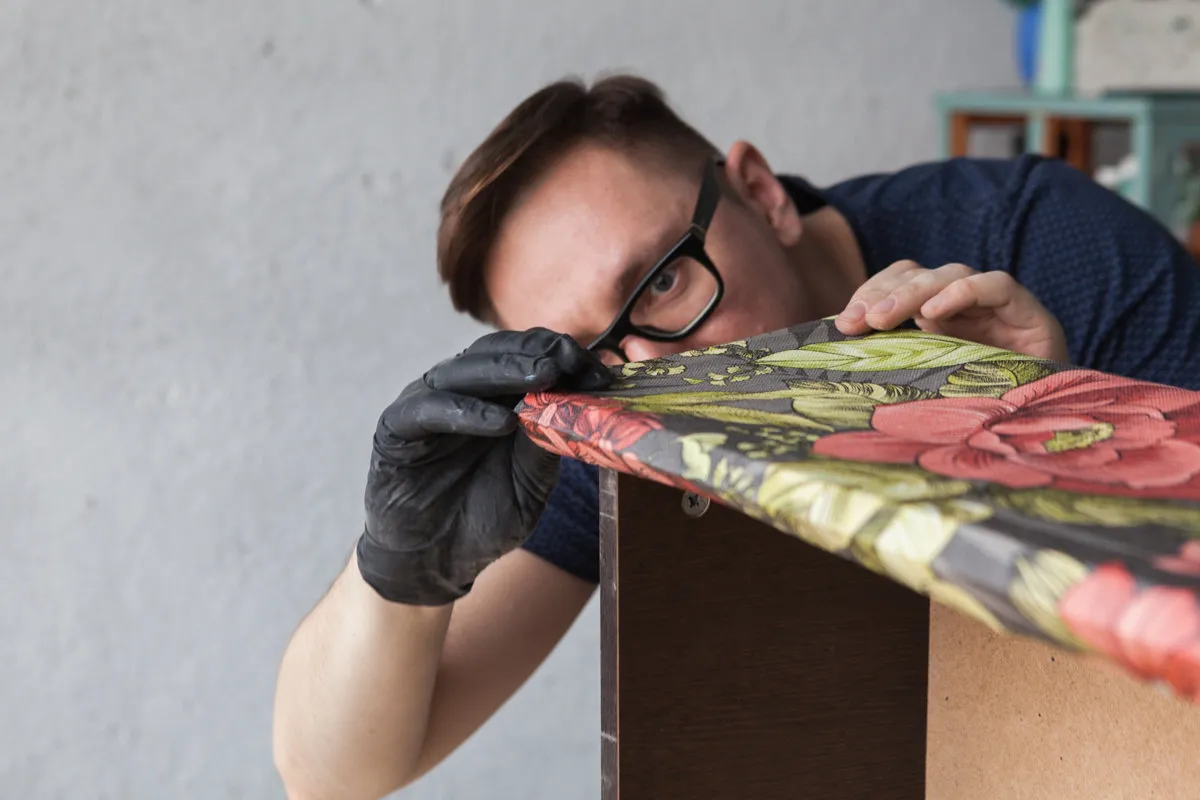 在前板表面涂上胶水并贴上墙纸。每边按压5–7分钟。或使用家具钉枪固定——胶水干透后小心取出钉子。