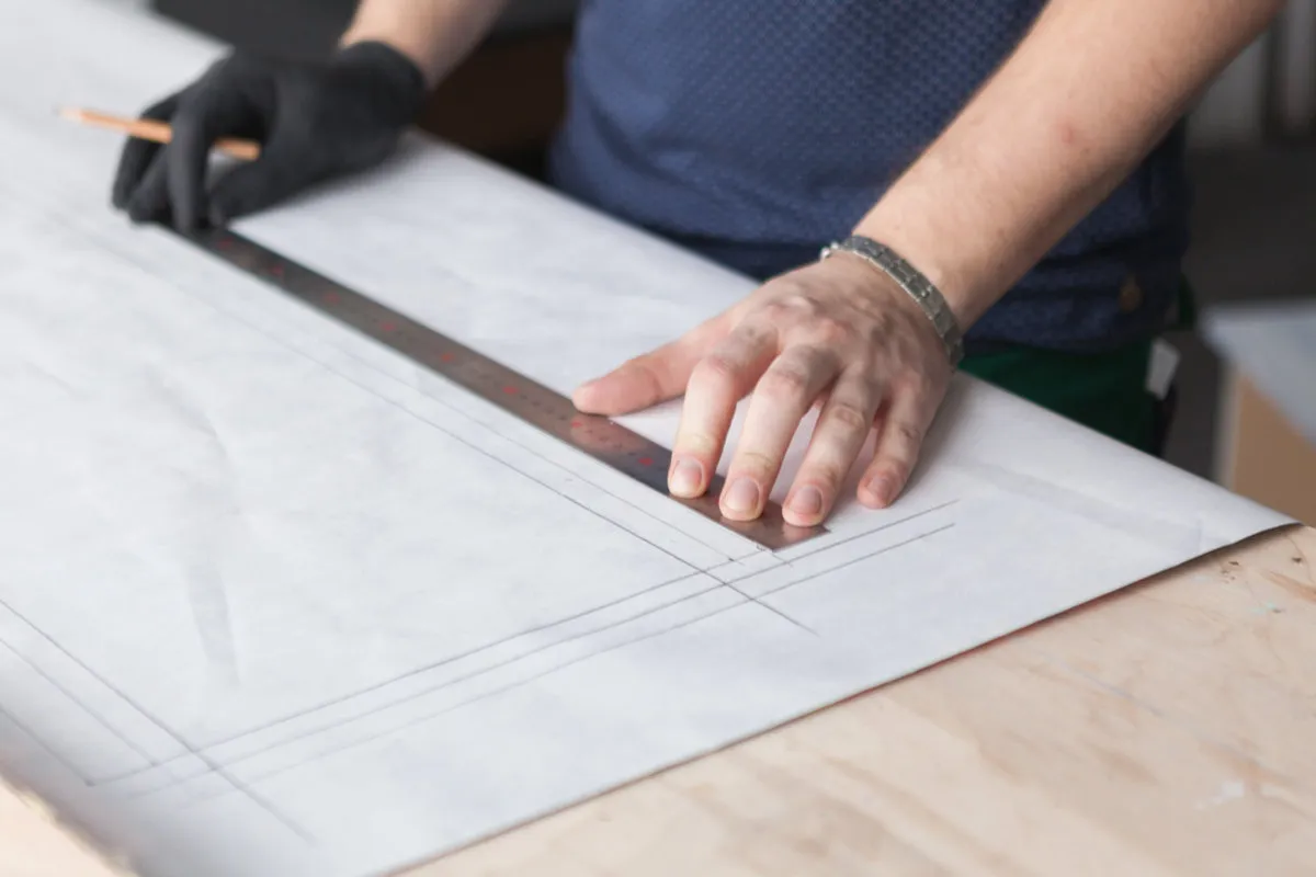 从墙纸制作模板。勾勒正面面板轮廓,并在每边增加1.5–2厘米以便将墙纸向内折叠。