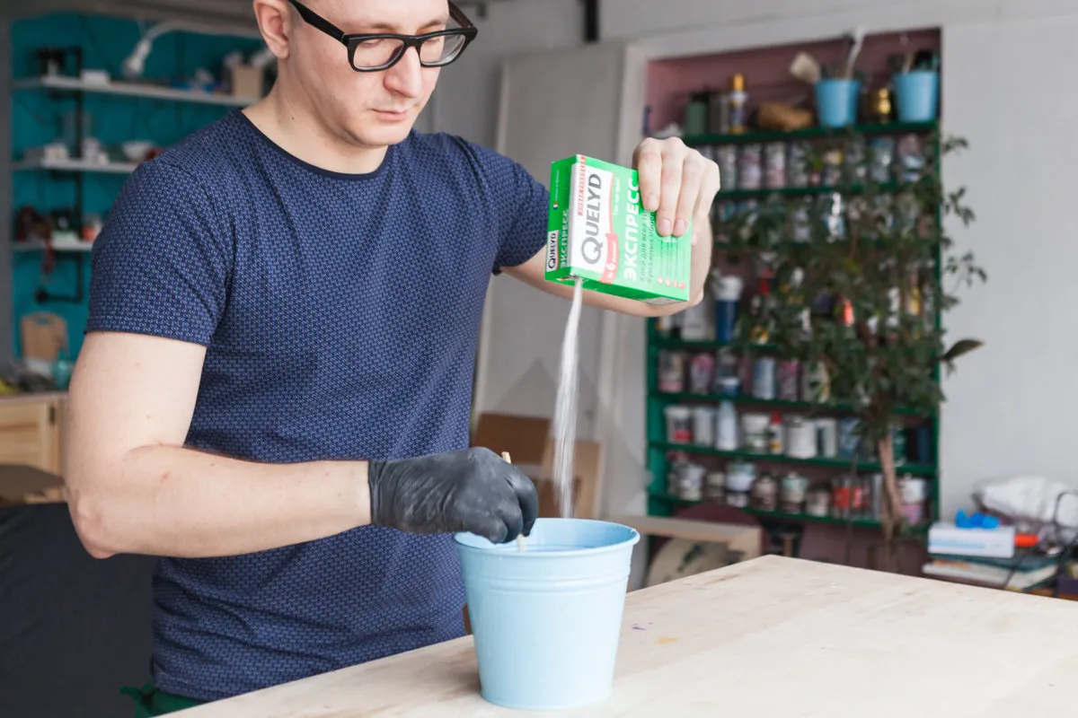准备胶水。我使用的是适用于各种纸质墙纸的QUELYD Express墙纸胶。即使是很薄的墙纸也不会变形,易于调配且经济实惠。