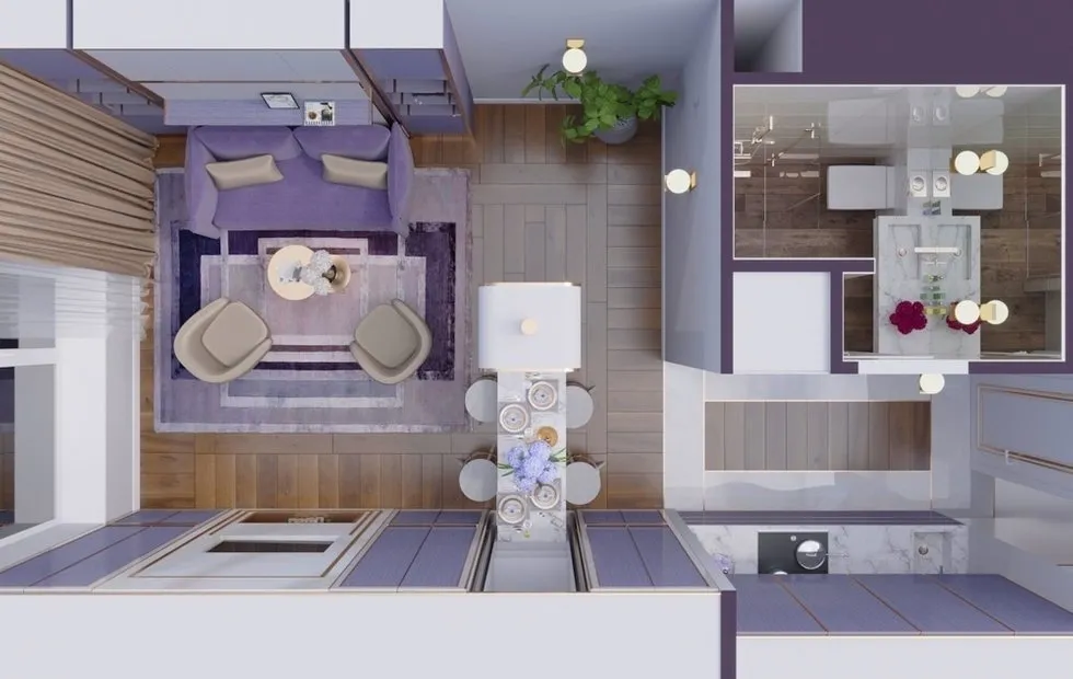 在我们的情况下,我决定强调复杂绿色与柔和紫色的混合——看这友谊多么充满活力!但不要过早焦虑——为了调和这种对比,我们将使用灰色、米色和牛奶色调——这些颜色将用于墙面装饰、家具和纺织品。这些柔和的颜色我们还将用薄荷色配饰和冷灰色蓝色来点缀——这将为客厅创造一个生动而精致的调色板。