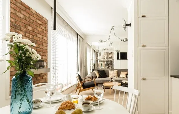 书房只能安排在原厨房的位置。厨房被移至原走廊并与客厅合并:一个透明的餐桌不占用空间,使其看起来明亮且家具布置简洁。