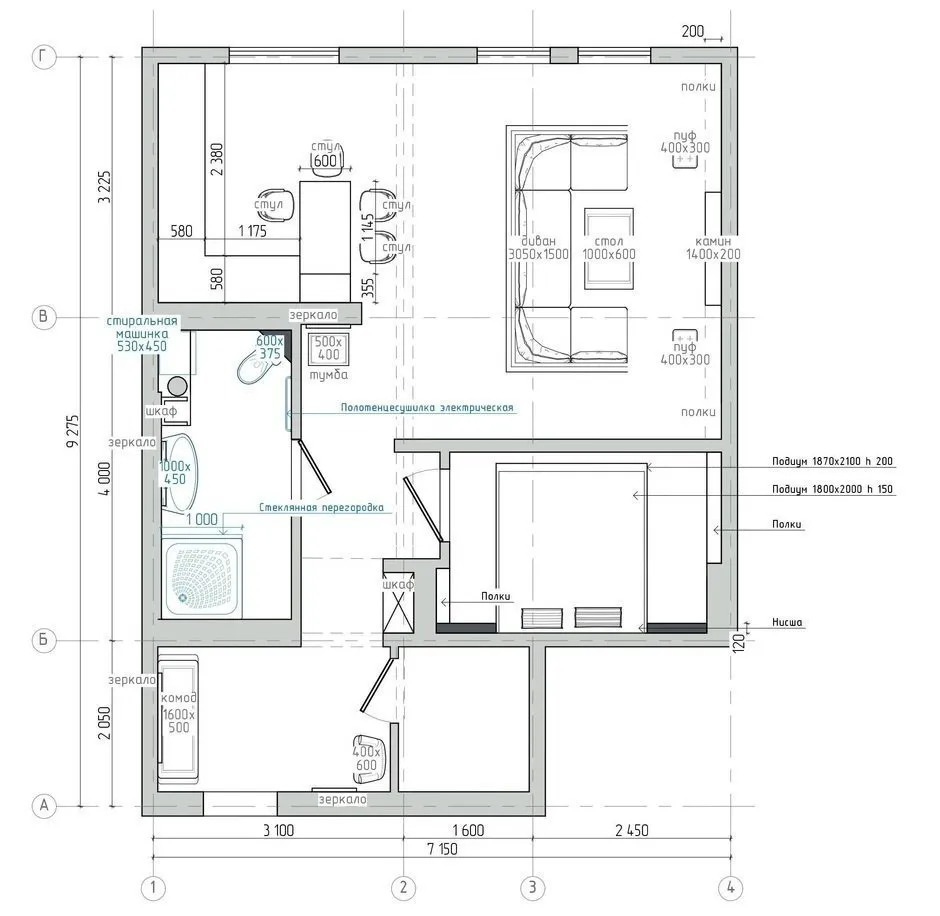 这栋砖石新建筑的布局未作更改——承重墙不允许重大改动。在单个宽敞的客厅中,尽管空间足够,仍需安排几个功能区域。这里出现了客厅、卧室、小型办公室和宽敞的储物系统。
