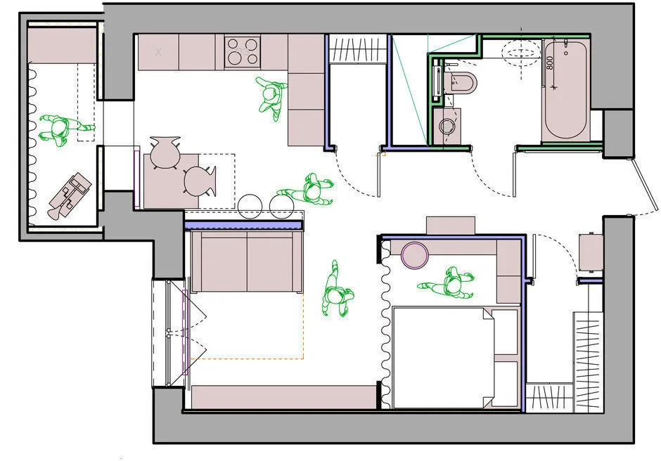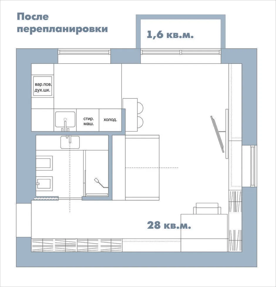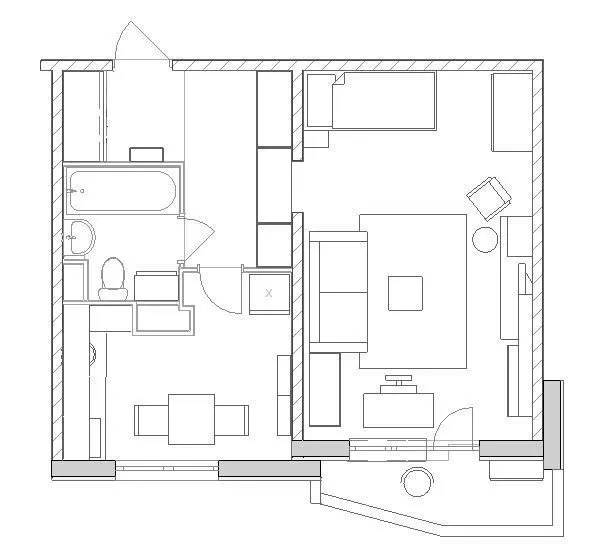 他们一开始就没有进行任何重新配置——最终,有一个独立的厨房和一个结合客厅和卧室的房间。卧室通过落地窗帘与客厅区域隔开,这是一个非常容易实施的解决方案。