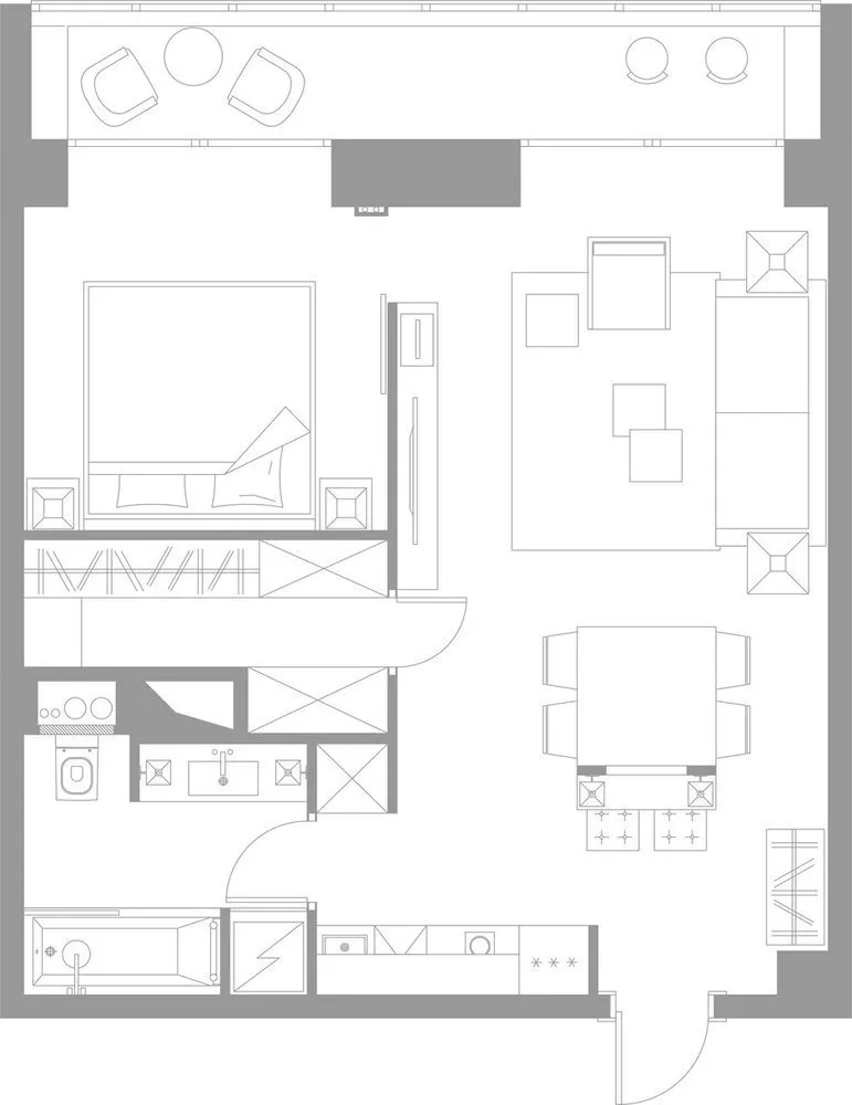 客户希望在一个工作室公寓中设置卧室、步入式衣帽间、厨房、餐厅和客厅。多亏了独特的布局,所有必需的房间都得以安排,而不影响通道。这种开放空间允许从不同角度和路线移动。