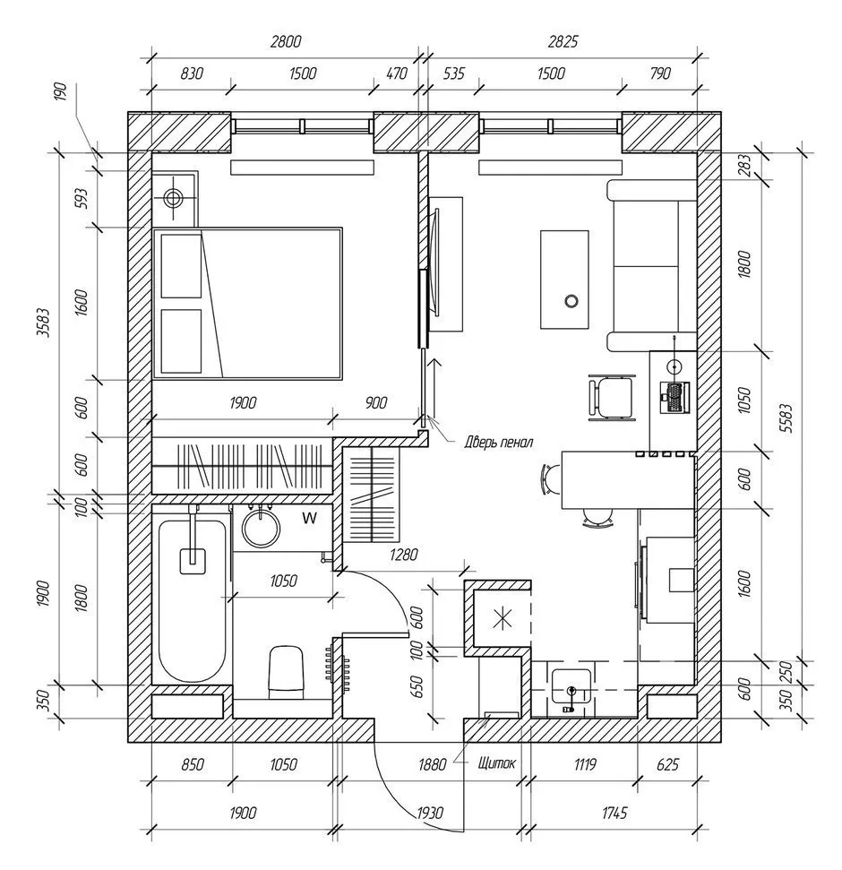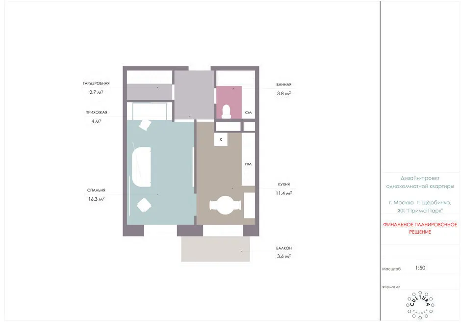 这栋砖石斯大林式建筑的工作室面积对一个完整的两居室公寓来说已经足够。挑战在于走廊、过道和储藏室占用了超过15平方米,只有两个窗户。SODA Homedecor的设计团队设法在不移动厨房的情况下创建了一个独立的卧室。