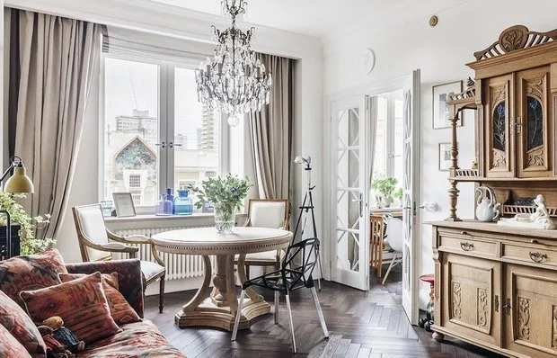 这套公寓的所有隔断都被拆除并重新建造。浴室装修选择了经典风格——地板和墙面铺设了温和暖色调的瓷砖。洗手台柜子是定制制作的,还增加了许多置物架,方便存放化妆品和配饰。