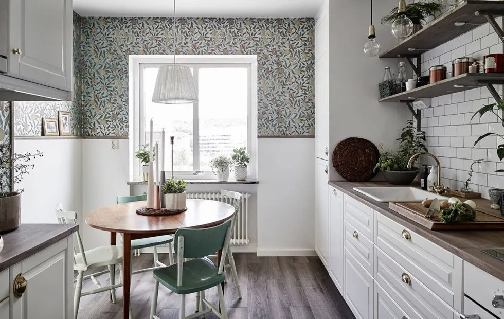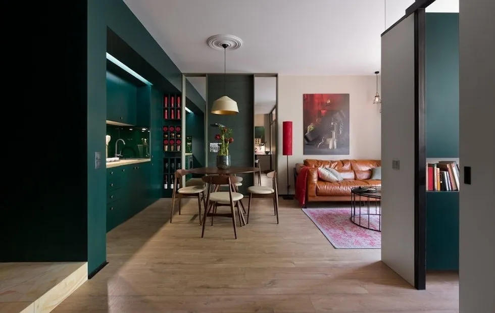 设计师Julia Belayeva不仅将门涂成墙面颜色,还用带有活跃图案的壁纸覆盖了相邻墙面。这些壁纸吸引了所有人的注意力。