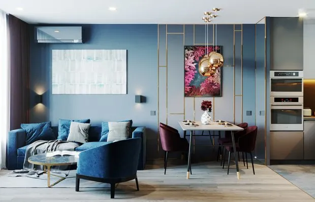 为了在客厅中隐藏一扇门,设计师Alena Chekalina将整面墙都覆盖了带有活跃图案的壁纸——甚至门本身也是如此。小图案不仅分散了人们对门轮廓的注意力,甚至连门把手也注意不到。