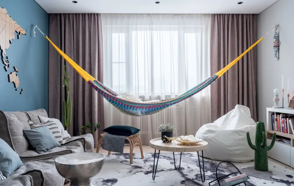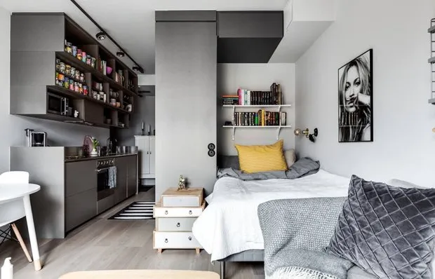 设计师达莉亚·纳扎连科希望创造一个体现客户个性的家居内饰,并在有限预算内完成。解决方案是将所有空间整合成一个工作室,同时使用可转换家具将客厅变为卧室。