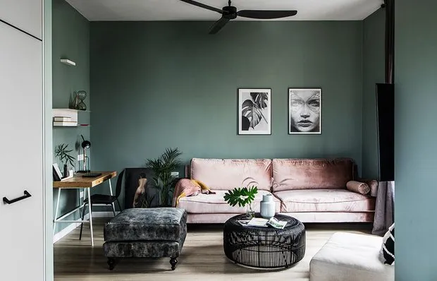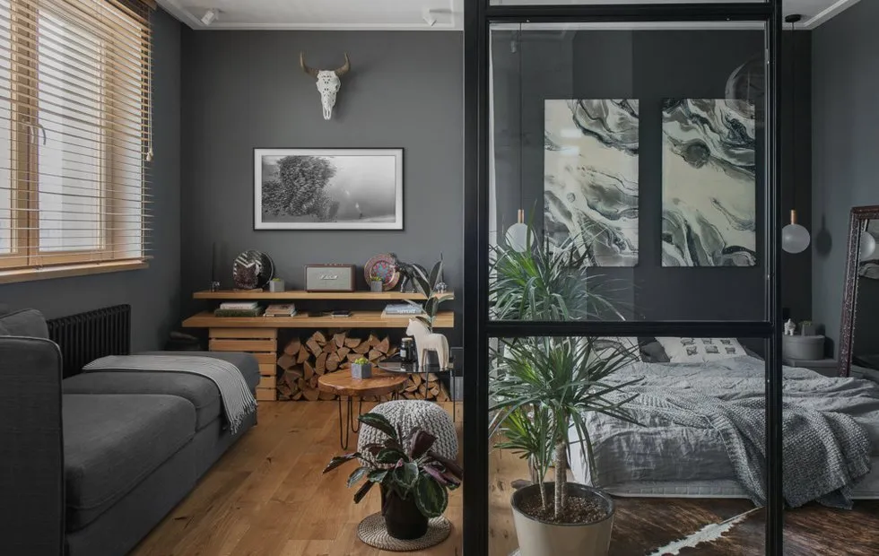 巧妙空间划分注意厨房与客厅之间的墙面是白色的,卧室则通过深灰色墙面从公共区域中视觉分离出来。