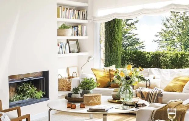 房屋中的客厅遵循同样的原则:没有多余元素。这里的亮点是用木板覆盖的天花板——木板的三角图案增强了空间的高度感。